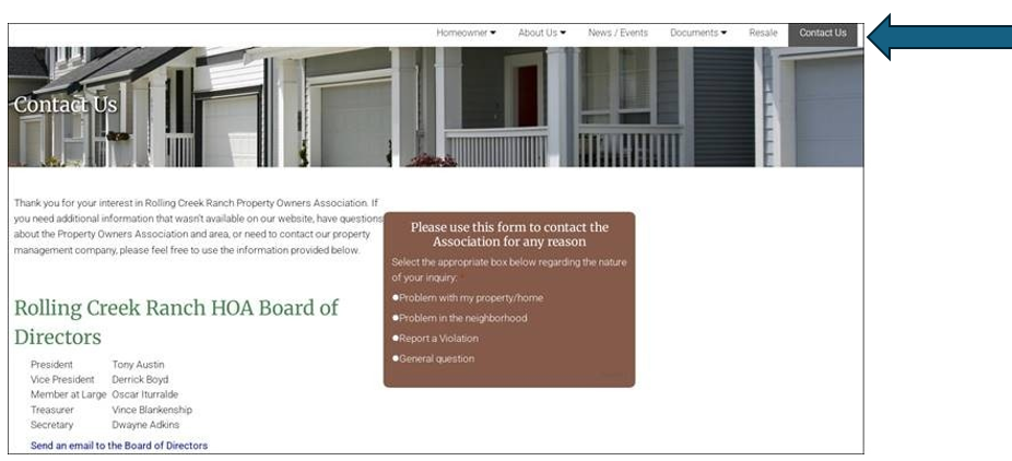 1. You must log into the website. All pertinent information on meetings and financial data requires you to login to access. If you are not logged in, you cannot access the data beyond the Builder Resources and Governing Documents. If you are unsure of your access, please contact the management company for assistance by clicking the contact us option at the top of the screen as illustrated. We can send you information for those who forgot a password or who have not registered: