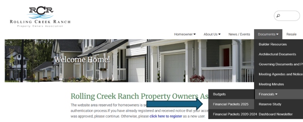 Step 2: To review the current financials (2025) , please click the tab “Financial Packets 2025” – illustrated below. Financial packets are prepared by a third party CPA firm, not the management company. The financials are then sent to the board and reviewed by the board and a Finance Committee comprised of fellow residents to ensure accuracy before posting the website. Once the process is complete and accepted, they are then posted to the website. For further information please reach out to your board at; boardofdirectors@rollingcreekranch.org